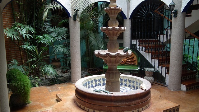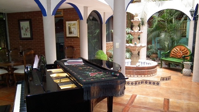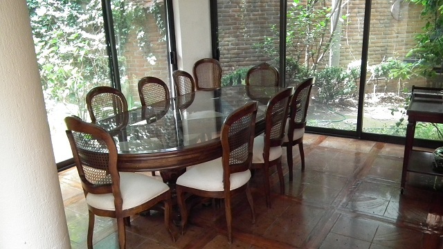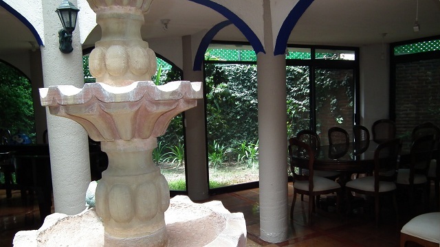 Sala y comedor con patio interior, fuente con triple altura y jardín interior, 1/2 baño, jardín de 60 m2 con asador, cocina equipada con desayunador, salón de fiestas, cuarto de lavado, cuarto de servicio con baño, patio de servicio, estudio o biblioteca con terraza y 1/2 baño, oficina con estrada independiente, recepción y 1/2 baño, 3 recamaras con baño cada una, principal con vestidor y estacionamiento para 5 autos cubiertos.