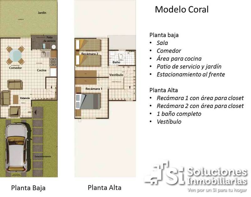 <<< PALMAS II >>> Palmas II cuenta con la mejor ubicación de Playa del Carmen: • A sólo 10 min. de las playas más hermosas del Caribe Mexicano • A sólo 15 min. de Puerto Morelos Modelo: CORAL Precio desde: $480,000 Cuenta con: Planta baja •• Estancia •• Comedor •• Área para cocina •• Patio de servicio y jardín •• Estacionamiento al frente Planta alta •• Recámara 1 con área para closet •• Recámara 2 con área para closet •• 1 baño completo •• Vestíbulo Acabados: ••Tarja en cocina •• Baños equipados con: regadera, WC y lavabo, loseta en áreas húmedas ••Muros con pasta texturizada ••Piso con loseta de cerámica ••Tirol en techos ••Cancelería de aluminio blanco ••Mosquiteros •• Tinaco con capacidad de 750 lts. ••Lavadero de concreto •• Losa de azotea con impermeabilizante integral ••Huellas de concreto ••Pasto exterior al frente •• División de muro con acabado de pasta texturizada en patios traseros Proyecto sujeto a cambios a discreción del desarrollador. MÉTODOS DE VENTA: INFONAVIT, FOVISSSTE, SHF/COFINAVIT, CONTADO, "Los precios pueden cambiar según el tipo de crédito".
