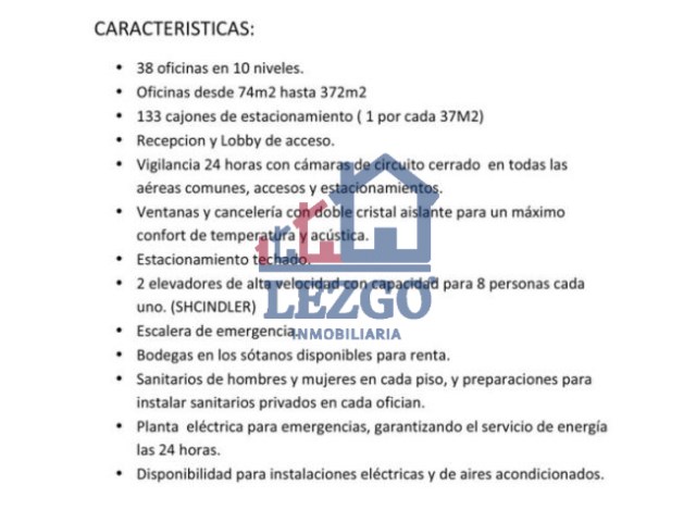*38 oficinas en 10 niveles V *oficinas de (74m2 hasta 372m2 ) *133 cajones de estacionamiento (1 por cada 32m2) *Recepción y lobby de acceso . *Vigilancia 24 horas con cámaras de circuito cerrado en todas las aéreas comunes ,accesos y estacionamientos . *Ventanas y cancelería con doble cristal aislante para un máximo confort de temperatura y acústica . *Estacionamiento techado . *2 elevadores de alta velocidad ,con capacidad para 8 personas cada uno .(SHCINDLER). *Escalera de emergencia muy practica . *sanitarios de hombres y mujeres en cada piso ,adaptación y preparaciones para instalar sanitarios privados en cada oficina . *planta eléctrica de emergencias ,garantizando el servicio de energía las 24 horas. *Disponibilidad para instalaciones eléctricas y aire acondicionado . #ref:OFICINA PENTHOUSE EN CORPORATIVO INOVA